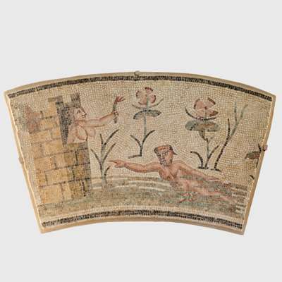 stone/marble tesserae, depicting the hero Leander swimming across the Hellespont to meet with his lover Hero, who is shown standing in a tower holding a burning torch