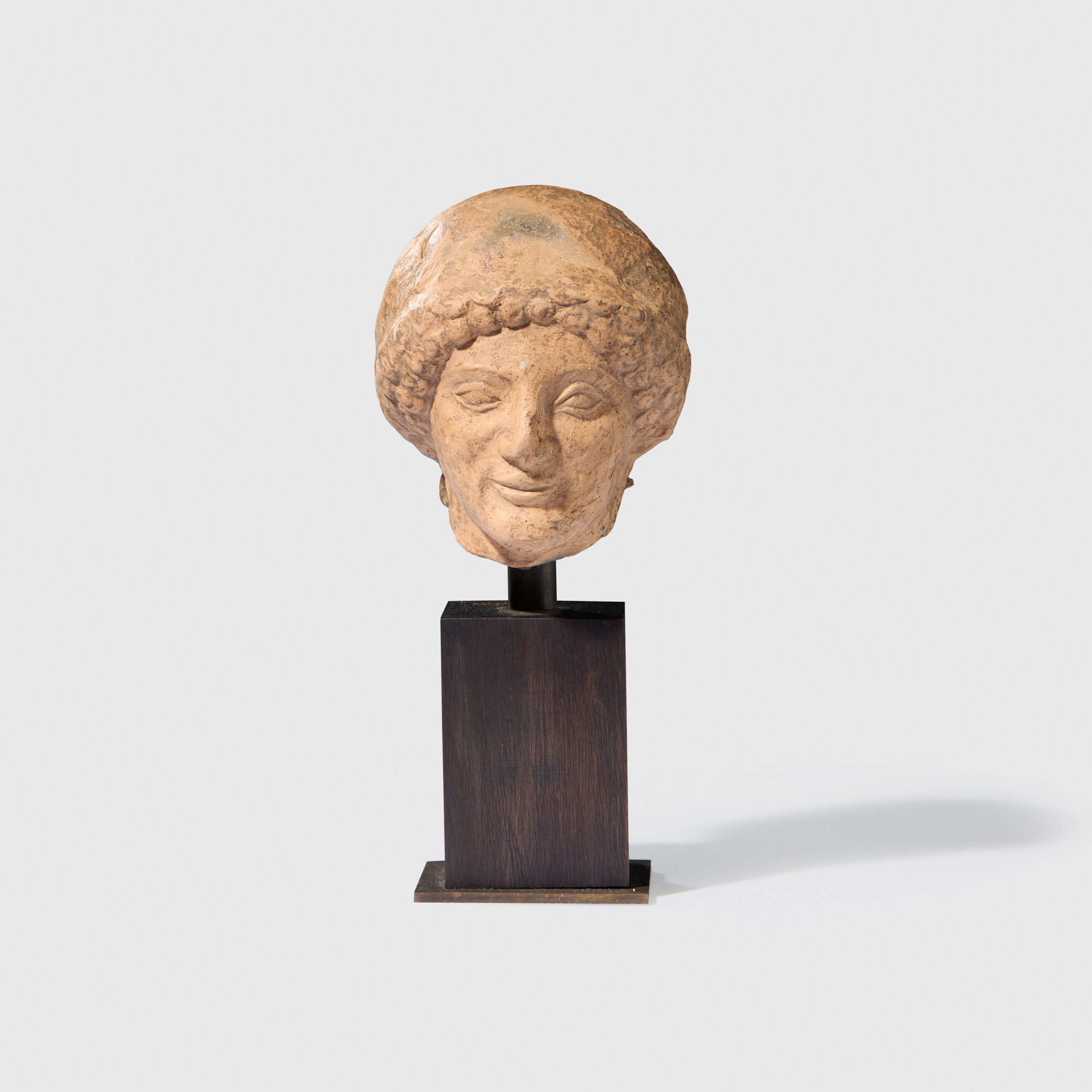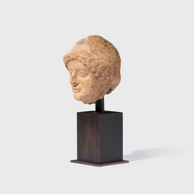 terracotta, of a young male, featuring a face framed by tight rows of curls and a small mouth forming a distinctive, enigmatic smile