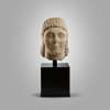 carved marble, with stylised features typical of the period, including a long oval face, high cheekbones, almond eyes, curving brows, and an enigmatic smile, the hair is finely carved, with undulating waves along the forehead, falling in plaits behind the ears and along the neck, fleshy lips formed into an enigmatic smile enhancing the expressive quality, raised on a bespoke mount