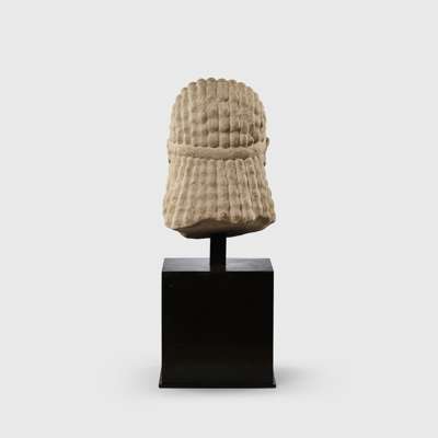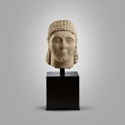 carved marble, with stylised features typical of the period, including a long oval face, high cheekbones, almond eyes, curving brows, and an enigmatic smile, the hair is finely carved, with undulating waves along the forehead, falling in plaits behind the ears and along the neck, fleshy lips formed into an enigmatic smile enhancing the expressive quality, raised on a bespoke mount