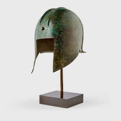 Passed from father to son, helmets were amongst the most prized items of the ancient hoplite. This striking example belongs to the class known as Illyrian. It is distinguished by the open face without a nose guard and parallel ridges running along the top intended for the attachment of a crest.