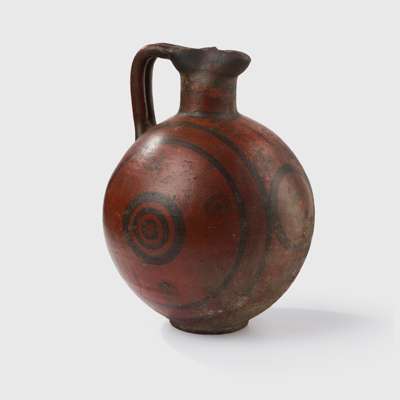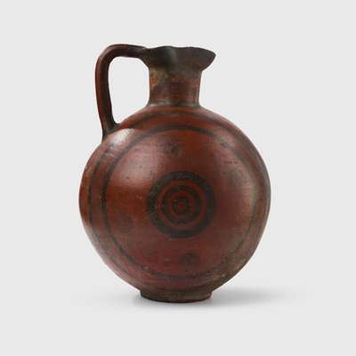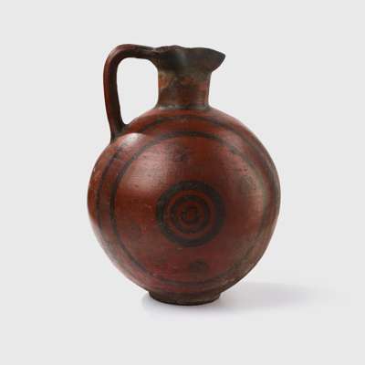 painted wheel-made pottery, ovoid body on a flat base, trefoil lip, single vertical handle from shoulder to neck ridge, decorated with narrow bands on the body and concentric circles executed in black pigment