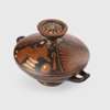 painted terracotta, standing on a stem base with strap handles and separate lid topped with a disc finial, the lid featuring two ladies of fashion separated by palmettes, both are shown seated, dressed in a chiton, with the drapery of their garments rendered through fine, linear strokes of black pigment
