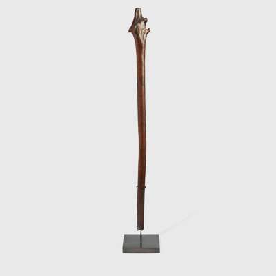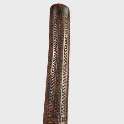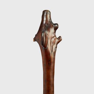 carved wood, the rootstock of a tree forming the head, the grip decorated with incised tavatava, raised on a bespoke mount