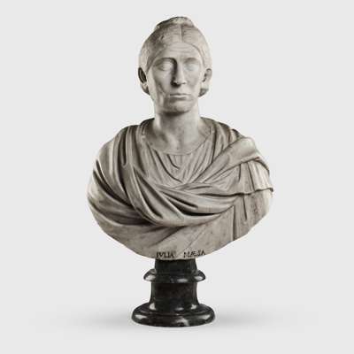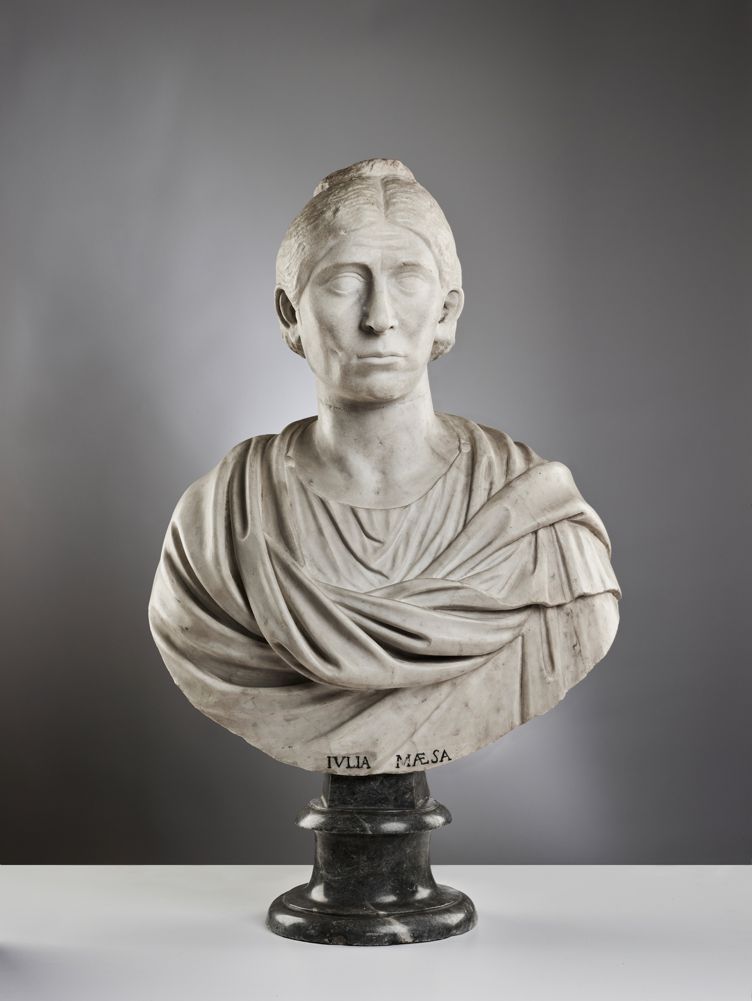 The head is mounted on an 18th-century bust bearing an inscription reading "Iulia Maesa" (died 224/225 A.D. in Rome). While this reflects an earlier attribution, stylistic analysis indicates the head belongs to a slightly later period.