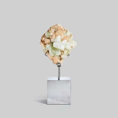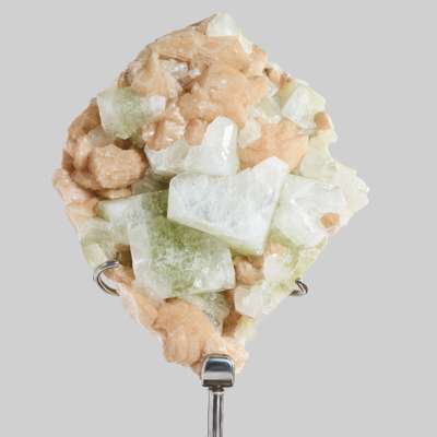 clustered prismatic crystals with a glassy lustre, predominantly colourless with subtle green hues, well-formed terminations with sharp edges, transparent to translucent, raised on a bespoke mount