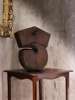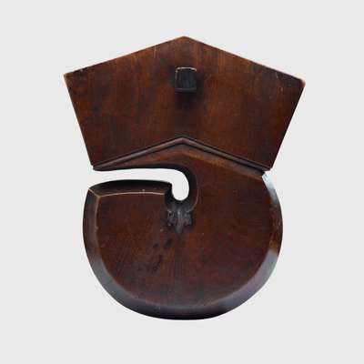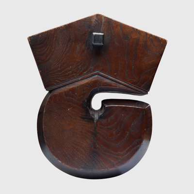 carved keyaki wood, a J-shaped form topped with a pointed “roof”