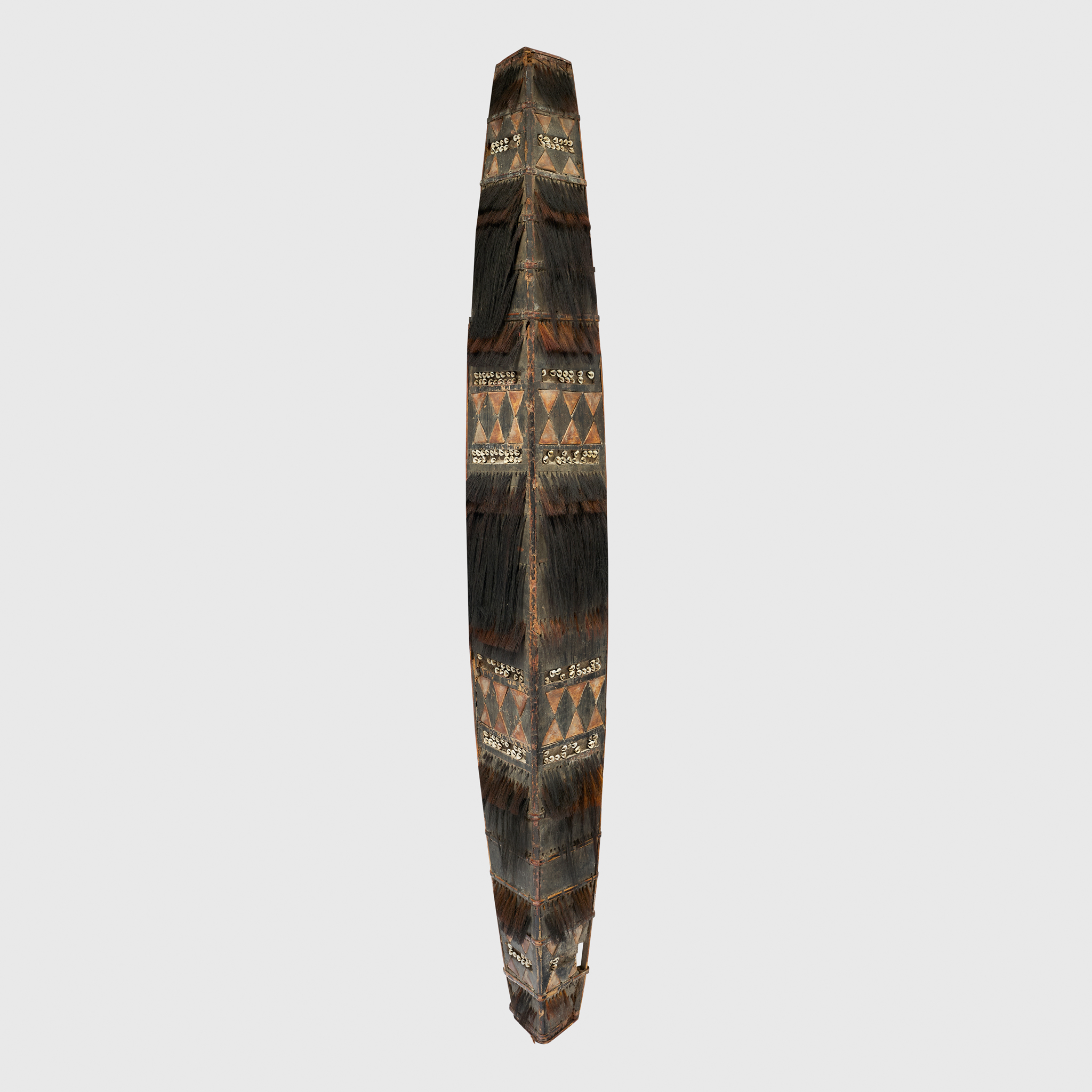 The present piece is a well preserved example of a kanta shield. The defensive weapon is characterised by its tall, narrow form with a slightly flaring waist, and is typically covered with goat hair. The custom of incorporating hair into the shield’s decoration shares similarities with the Dayak shields of nearby Borneo, which often feature human hair. While the Dayak shields traditionally used hair from fallen enemies, it is possible that, historically, kanta shields may have also displayed human hair, reflecting the shared cultural practices of the region.