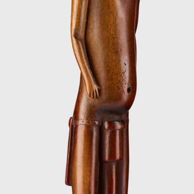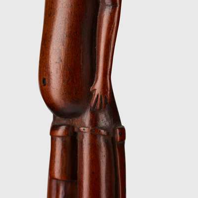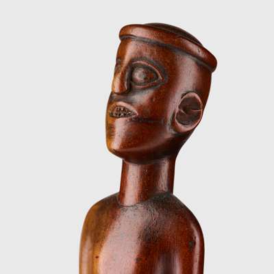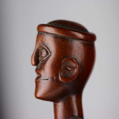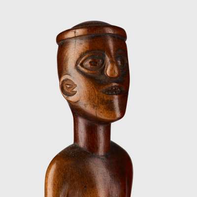 “As early as the mid to late nineteenth century, several Zulu carvers living in the Pietermaritzburg and Durban areas of the Colony of Natal began to produce figurative staffs and statuettes inspired by the example of migrant Tsonga sculptors familiar with the tradition of carving didactic works for use in initiation lodges. Because of their close proximity to major colonial centres, these Zulu carvers adapted their skills to serve different markets. Many made works for European buyers while at the same time producing staffs for local African elites. Examples like this one were presumably made for sale either to chiefs or to comparatively wealthy household heads. Although it is not clear precisely what function these staffs might have served, it is fair to assume that they were carried at public functions like weddings and celebrations in honour of the ancestors. As such, these staffs would have drawn attention to the wealth and/or status of the owner.” (Klopper, Nettleton and Pethica 2007)