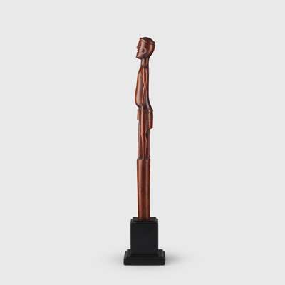 carved wood, the staff leading to an exceptionally finely carved standing figure, depicted with a slight paunch, arms held at the sides, the distinctive facial features including wide oval eyes dominating the face, framing a broad nose with an open mouth below, raised on a bespoke mount