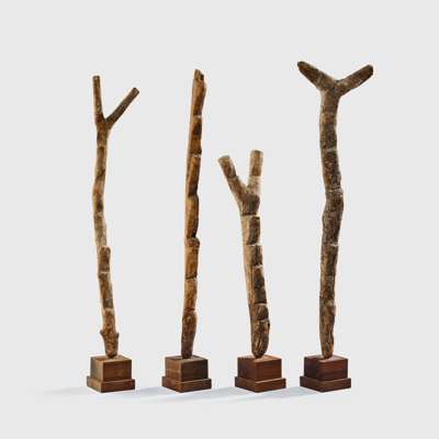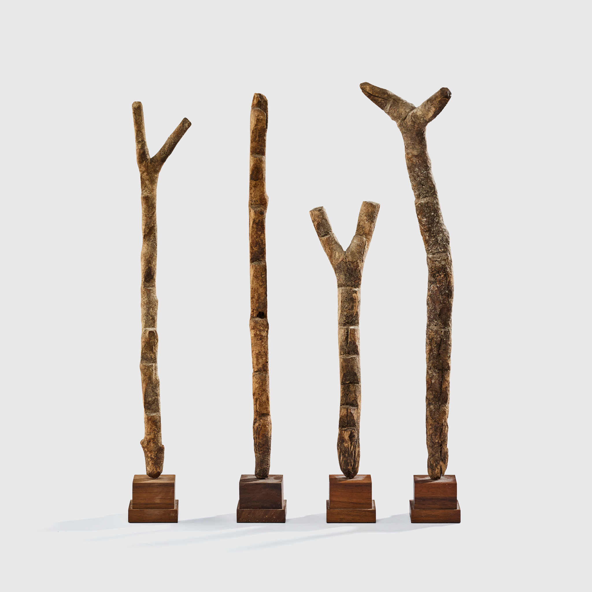 carved wood, each carved from a single piece of wood, displaying a slender form adorned with spaced rectangular rungs and dual short protrusions above, raised on bespoke wooden mounts (4)