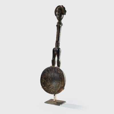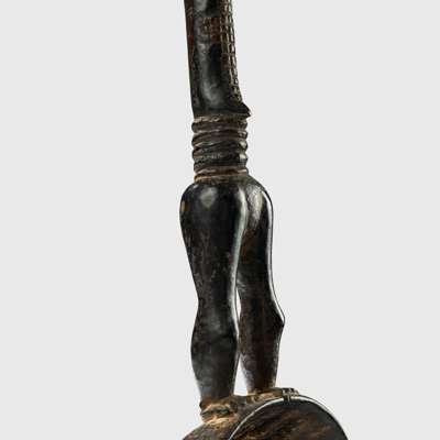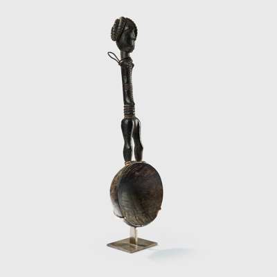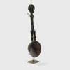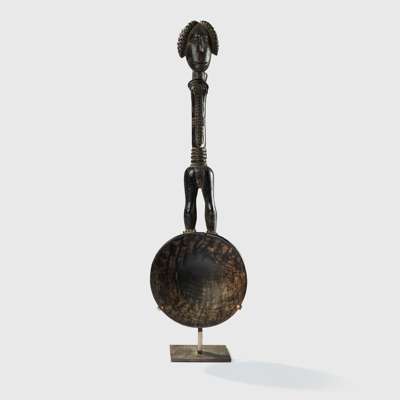 carved wood, handle in shape of a slender, elongated female figure with body scarification, coiffure in several lobes, heading to a deep rounded ladle, raised on a bespoke mount