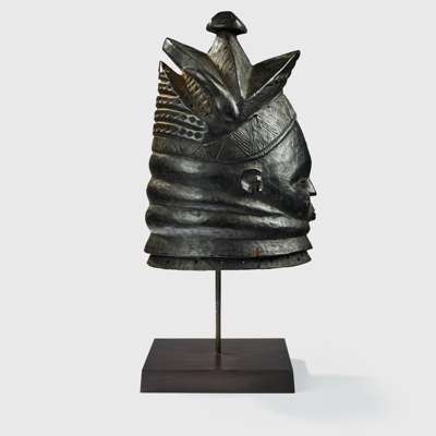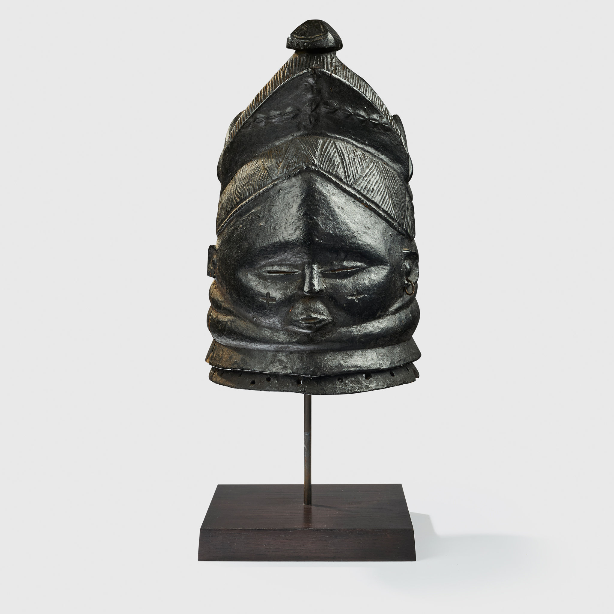 Mende sowei masks are an integral part of the cultural and spiritual practices of the Mende people in Sierra Leone. Used primarily in women’s initiation ceremonies, these masks symbolise beauty, femininity, and the transition into womanhood. Characterised by their elegant, elongated forms and intricate details, sowei masks often feature smooth, rounded faces adorned with elaborate hairstyles and decorative elements, with the presence of fat rolls signifying perfected beauty and health.