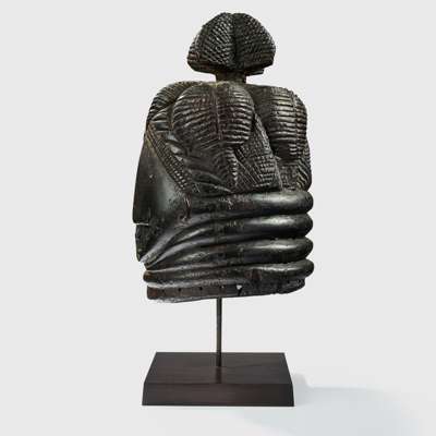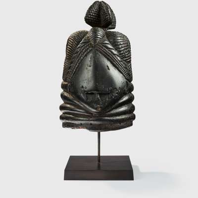 Mende sowei masks are an integral part of the cultural and spiritual practices of the Mende people in Sierra Leone. Used primarily in women’s initiation ceremonies, these masks symbolise beauty, femininity, and the transition into womanhood. Characterised by their elegant, elongated forms and intricate details, sowei masks often feature smooth, rounded faces adorned with elaborate hairstyles and decorative elements, with the presence of fat rolls signifying perfected beauty and health.