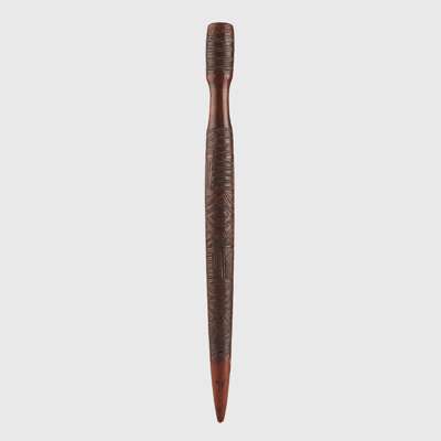 carved wood, with a rounded terminal handle, narrowing at the neck before widening again and tapering to a point, the upper third below the handle ornately carved, fine reddish patina