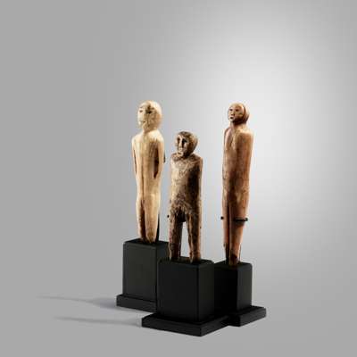Thule culture, flourishing from approximately 200 B.C. to 1500 A.D., is recognised as the precursor to modern Inuit societies across the Arctic regions. Their artistic expressions are predominantly observed in utilitarian objects such as combs, needle cases, and various utensils, which often feature minimalistic designs and delicate incisions. A notable aspect of Thule artistry is the creation of small, elegantly shaped female figurines, typically carved from ivory or wood. These statuettes are characterised by their elongated forms, broad shoulders with truncated arms, and minimal facial features, often lacking detailed facial carvings. The exact purpose of these figures remains a subject of scholarly debate; some suggest they served as amulets imbued with spiritual significance, while others propose they functioned as dolls, possibly dressed and used in social or ceremonial contexts.