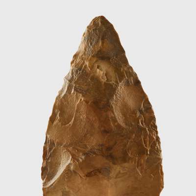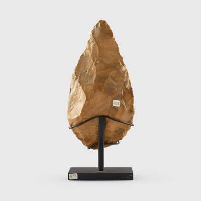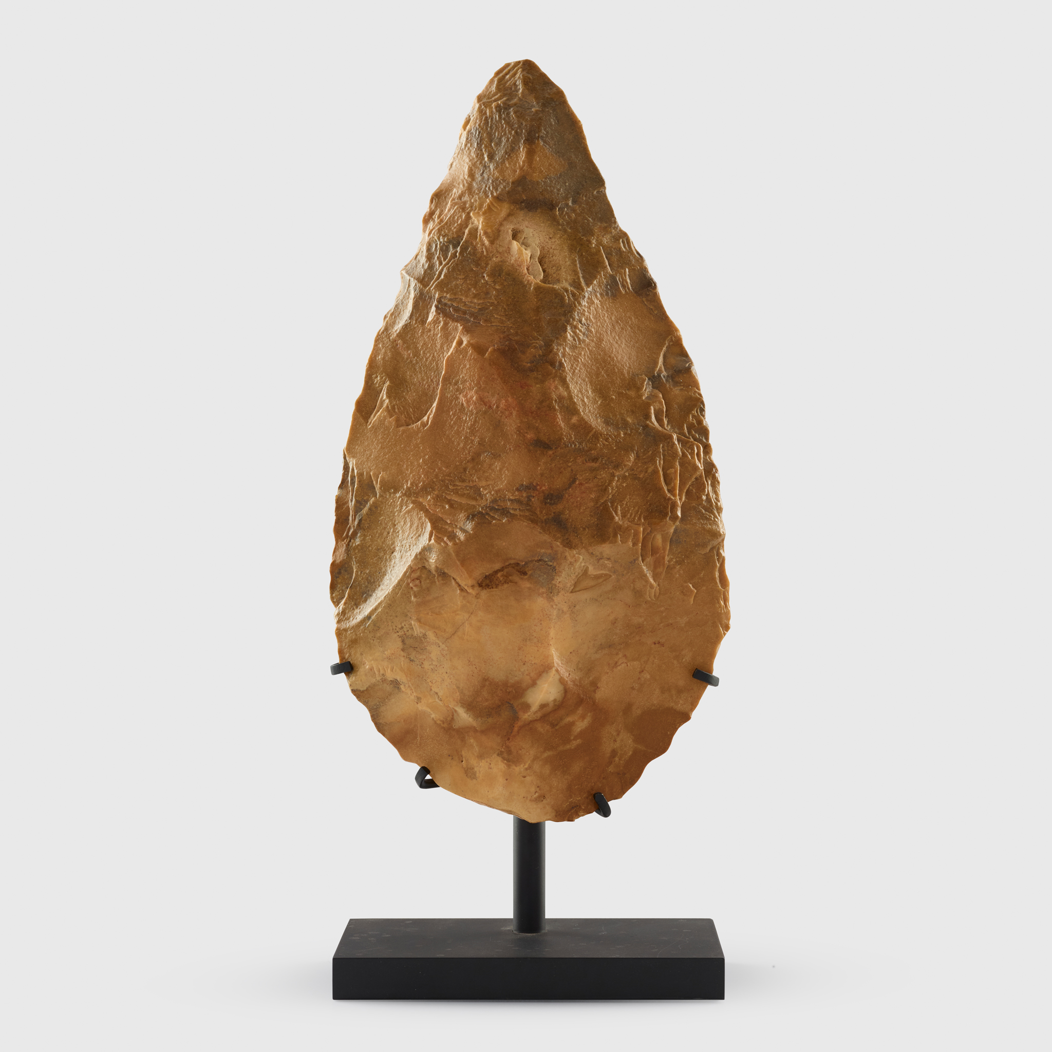 This Acheulean handaxe, with its sand blasted patination coming as the result of centuries of exposure to the Saharan environment, dates to around 250,000 B.C. It was used for tasks such as digging, chopping, and butchering.