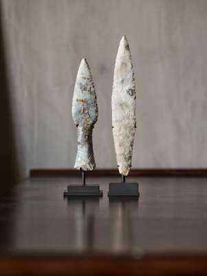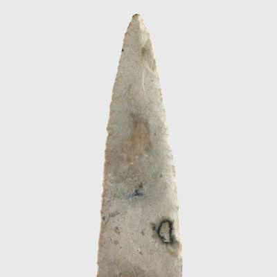 knapped light grey flint, of lanceolate form, tapering to a point, raised on a bepsoke mount