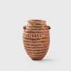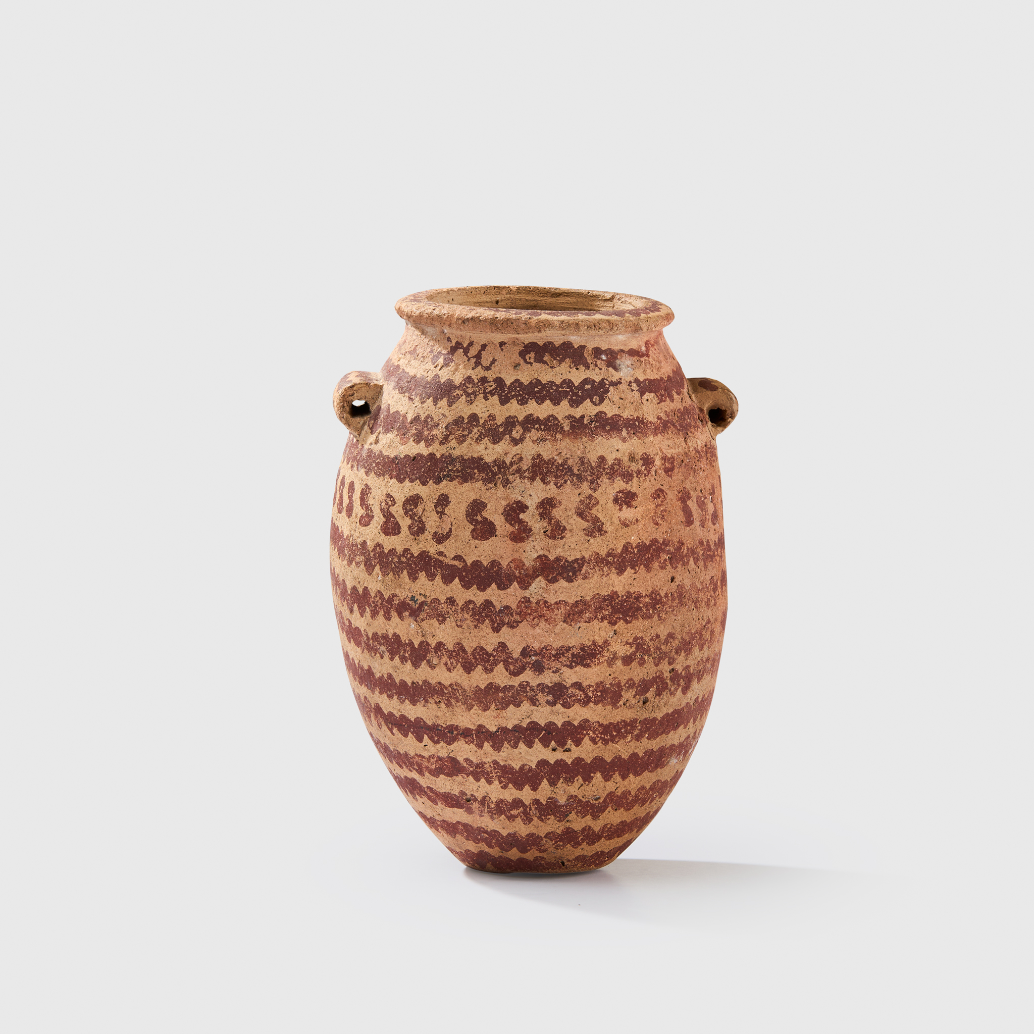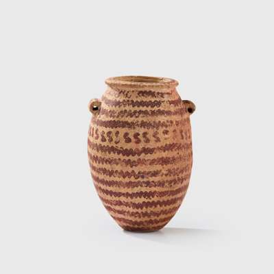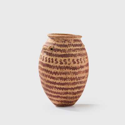 painted terracotta, ovoid vase with two pierced lug handles for suspension, the body adorned with undulating lines executed in burnt orange pigment imitating rushes