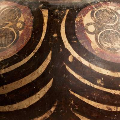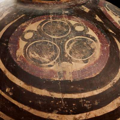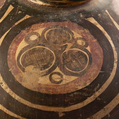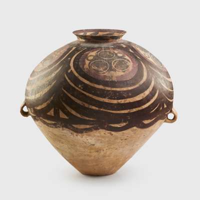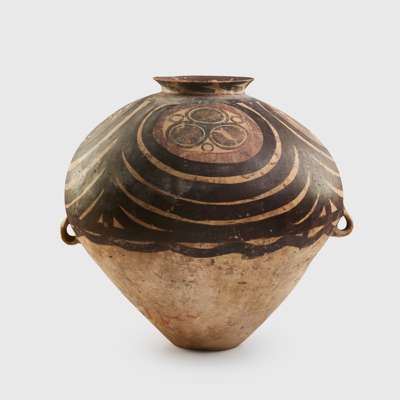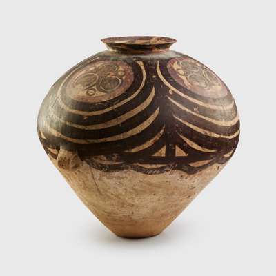 The Yangshao culture and the following Majiayao culture (c. 5000–2000 B.C.) were Neolithic civilisations that flourished along the middle reaches of the Yellow River in China. Known for their early advancements in agriculture, these cultures practised millet farming and domestication of animals, supporting settled village life. Yangshao and Majiayao societies are particularly noted for their painted pottery, often featuring geometric and stylised motifs in black and red on buff-coloured earthenware. These ceramics, typically hand-built using coiling techniques, suggest a sophisticated aesthetic sensibility and possible ritual or symbolic significance.