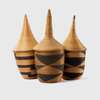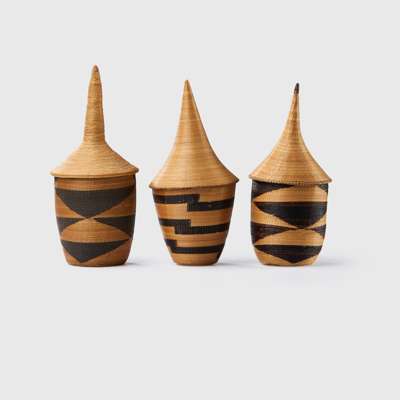 Traditional Tutsi miniature baskets, known for their exquisite craftsmanship, embody both artistic refinement and cultural significance. These finely woven baskets, often featuring intricate geometric patterns in black and natural gold hues, reflect the striking conical roofs of traditional Tutsi houses. Their delicate construction required exacting skill, with women of the Tutsi elite using locally sourced fibres and natural black pigments to create visually dynamic compositions. Unlike larger utilitarian baskets used for storage, these miniatures served as prestigious gifts, safeguarding precious items like amulets, beads, or the master of the house’s pipe.