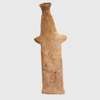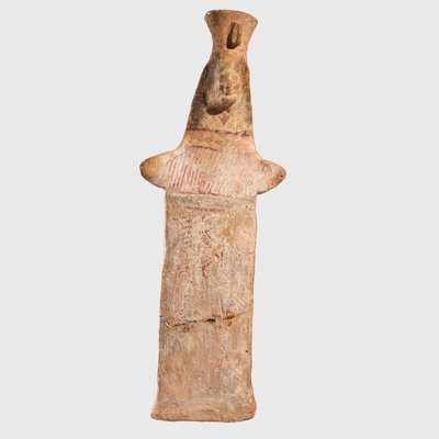painted terracotta, hand modelled, a fine papades idol, standing on an oval base, the contours of the flattened body hidden by the garment, the face with archaic features, large eyes outlined in black, red cheeks, a wide, smiling red mouth, and long black painted hair falling down to the shoulders, raised on a bespoke mount, marked with an old inventory number reading “166”