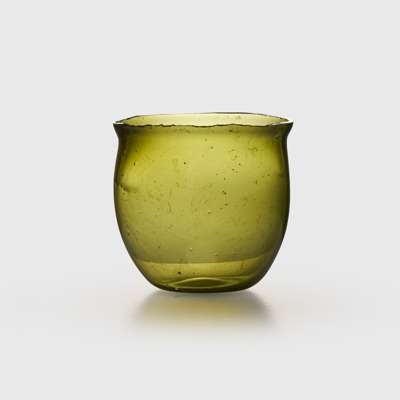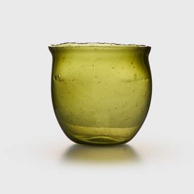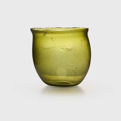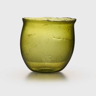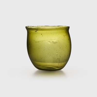 The Merovingian dynasty covered much of modern France, Belgium, and Germany in the transitional time between Antiquity and the Middle Ages. Small glass vessels were mostly used for drinking, with complete pieces, such as this one, primarily being found in cemeteries. Colourless glass was most common during this period, with green glass being less abundant. Composition analysis has shown that the green colour is mostly due to the presence of iron, with the structure similar to Late Antique glassware. Whilst the number of Merovingian glass objects appears to decrease in the second half of the 6th century AD, the proportion of green glass increases and their shapes become more rounded. The presence of Merovingian glass in Southern England is a testament to the legacy of the late Roman Empire and the continuation of long-distance trade.