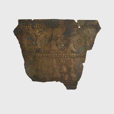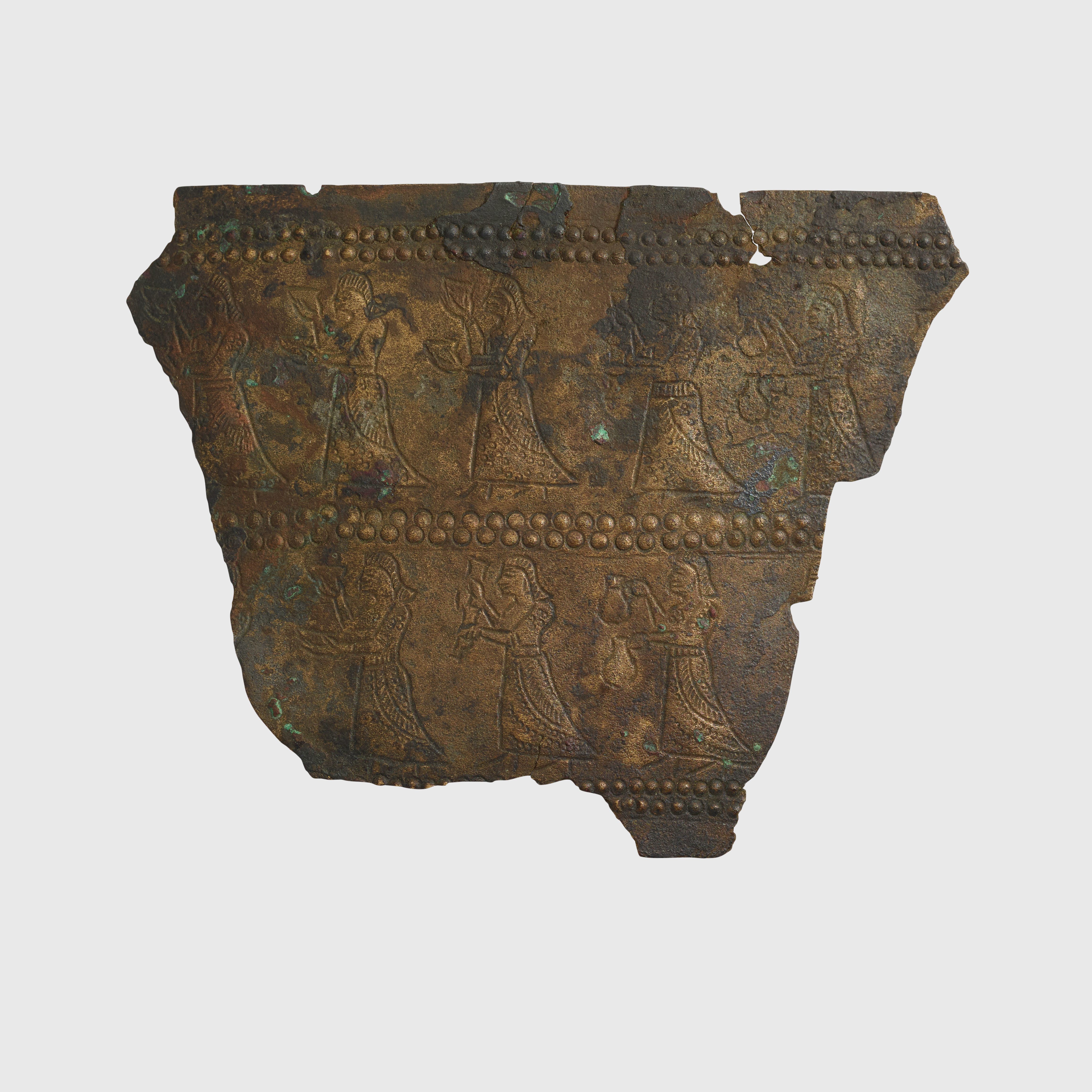 engraved bronze, with perforations along the border for attachment to a leather backing, decorated with images of worshippers shown with their arms raised
