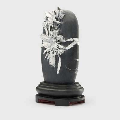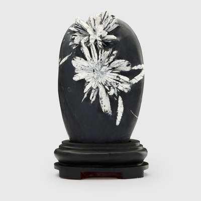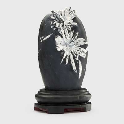 The flower-like patterns in chrysanthemum stones are typically formed by radial crystal growth of celestite, calcite, or andalusite within a matrix of dark limestone or shale. These striking formations result from sprays of celestite crystals embedded within dark stone, creating a captivating natural display.