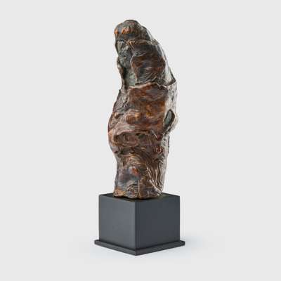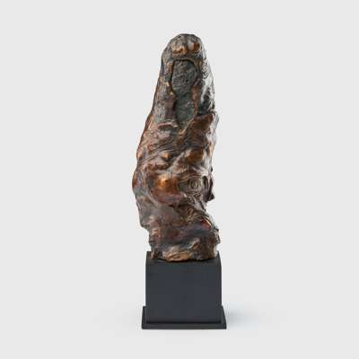 wood, the figure emerges organically from the gnarled, weathered surface, the wood displays a lustrous patination
