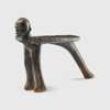 carved wood, he long seat supported by three legs, two positioned at one end beneath a handle carved in the form of a stylised human head, worn patina from age and use