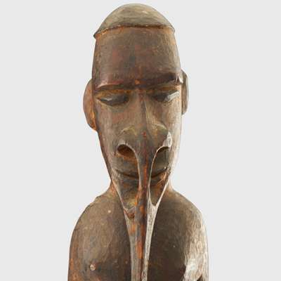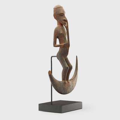 Sepik suspension hooks serve both practical and ceremonial purposes. Hung from rafters by a cord, they support baskets or string bags filled with food or belongings, keeping them out of reach of pests. Many are carved with images of ancestral spirits or animals linked to the owner's clan. Some depict powerful supernatural beings called waken and were used in ritual settings. Men would gather in the ceremonial house to make offerings and seek advice from these spirits. Offerings such as chickens or betel nut were hung from the hook and consumed by a medium, who entered a trance and spoke on behalf of the spirit. Everyday hooks were also used to consult spirits on more routine matters.