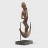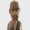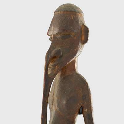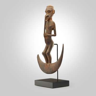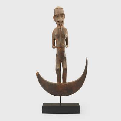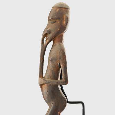 carved wood, standing male figure with elongated torso and stylised facial features, arms bent at sides, hands resting on abdomen, crescent-shaped hook base, dark patina, surface wear and age cracks consistent with age and use, mounted on custom base