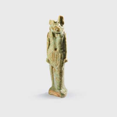 Faience, the deity Anubis shown as a man in a striding position with a jackal head, wearing a kilt with his arms extended down the sides of his body, standing on a rectangular base with a back pillar, a hole pierced behind the chest