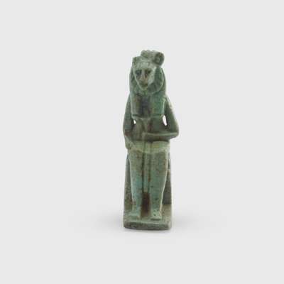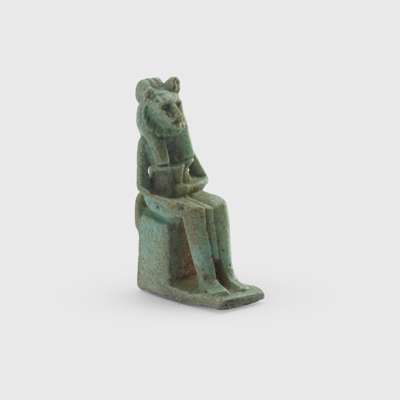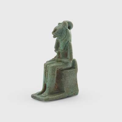 faience, depicting the lion headed goddess Sekhmet, shown seated on a throne with the left arm resting on the lap and the right arm extending down towards the knee, perforated for attachment