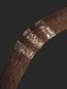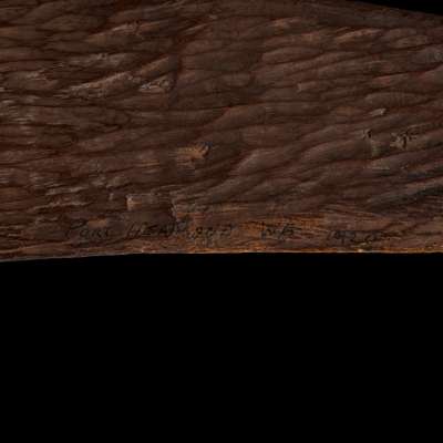 carved wood and pigment, of typical curved and tapered form, engraved hatching throughout, with three painted bands at the mid-section, raised on a bespoke mount, bearing an inscription reading: