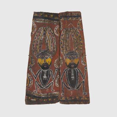 pigment on dual sago spathe panels, each panel depicting a stylized ancestor figure with elaborate headdress, squatting, with the arms raised above the head, rendered in polychrome pigments of red, yellow, black and white