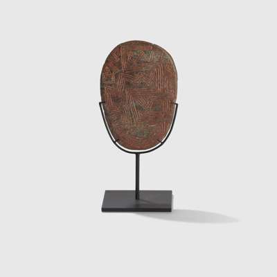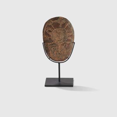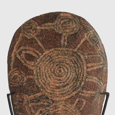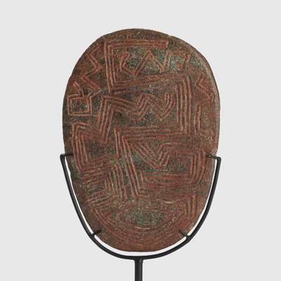 incised stone and natural earth pigments, elongated ovoid, both faces finely incised with complex geometric designs comprising concentric circles, radiating lines and meandering linear motifs, accented with ochre, raised on a bespoke mount
