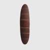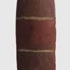 carved wood and pigment, of elliptical form, the obverse with fine fluting and horizontal lines of white against an ochre ground, the reverse with an integral handle