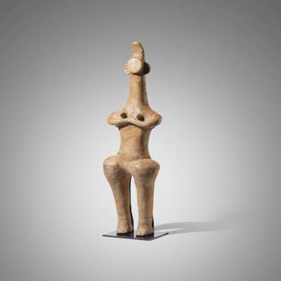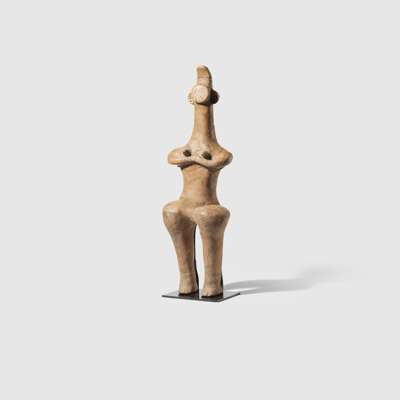 terracotta, large terracotta figure, highly stylised standing figure depicted nude, with exaggerated broad hips and short tapering legs, arms curved forward towards the small breasts, elongated neck supporting a head with abstracted features, raised on a bespoke mount