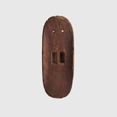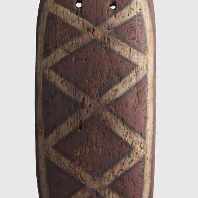 carved wood and pigment, of elongated oval form with rounded ends, the obverse adorned with a series of interlocking diamond motifs, dual perforations to top, with integral handle to reverse, accompanied by a stand intended for wall mounting