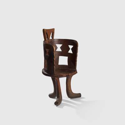 wood, carved from a single trunk, standing on three rounded legs with wrap around backrest, deep patination