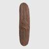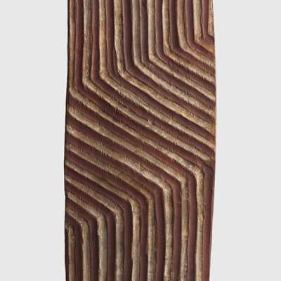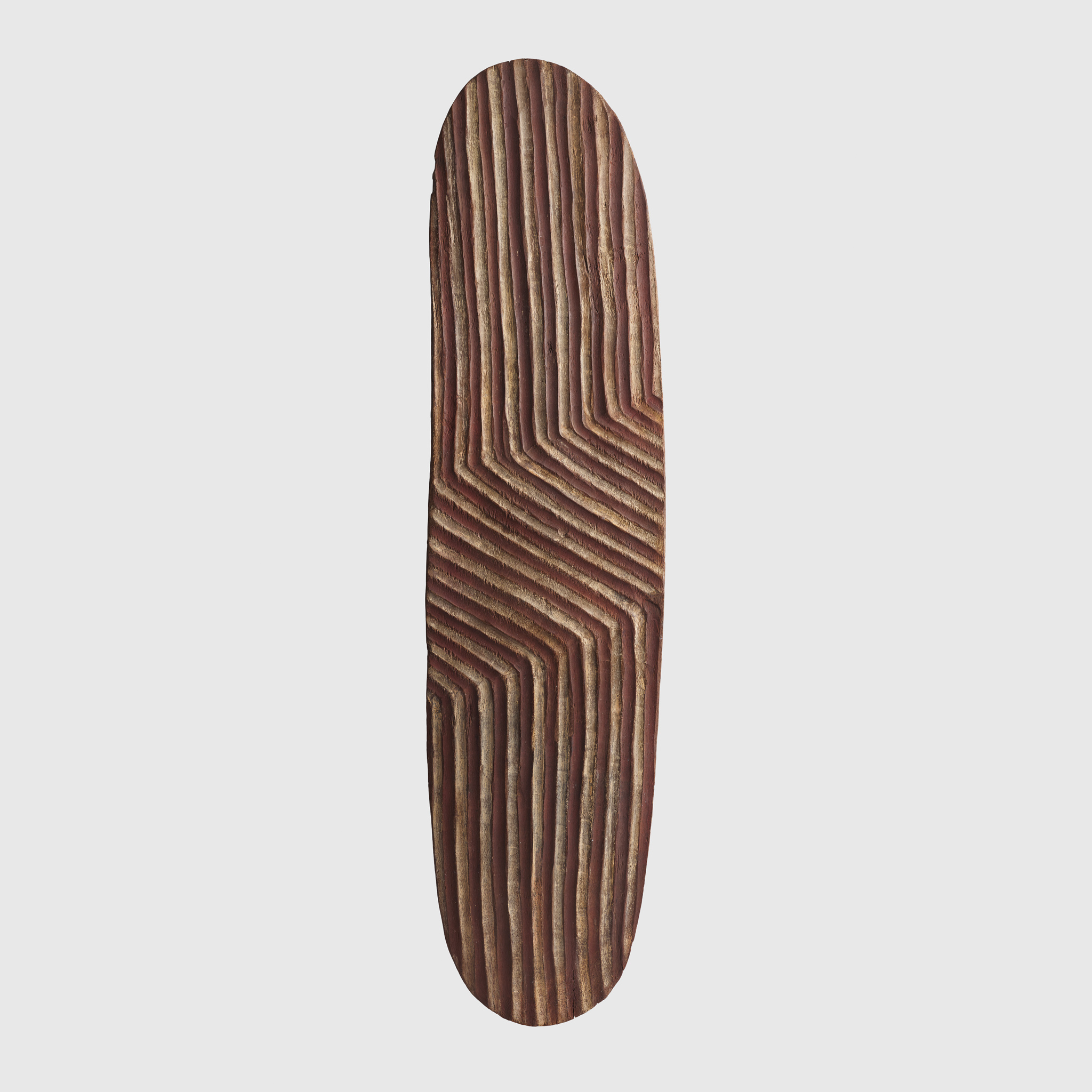 wood and pigment, of long elliptical form, decorated with zigzag motifs composed of a series of longitudinal grooves divided into three sections, coloured with red and white ochre, the reverse adorned with vertical bands arranged in nine sections and bordered by horizontal grooves, fine patination and wear to the handle indicative of use, accompanied by a bespoke mount for wall display
