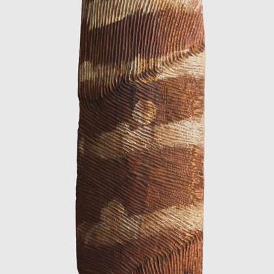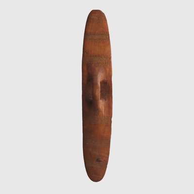 carved wood and pigment, he elongated, slightly convex form tapers towards both ends, the front decorated with alternating bands of diagonal hatching and cross-hatching in ochre and white pigment, with integral handle to reverse, accompanied by a bracket intended for wall mounting