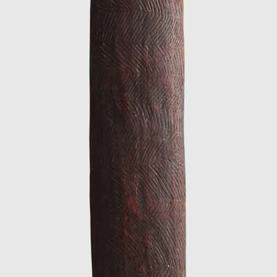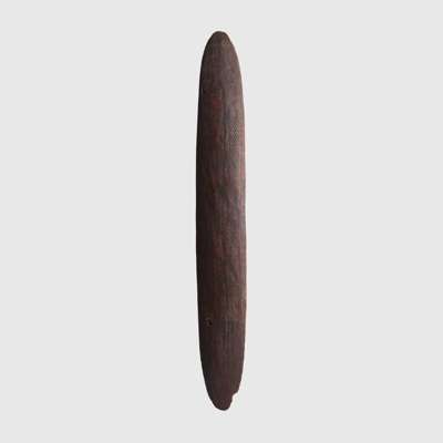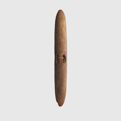 carved wood, of elongated oblong form, adorned with horizontal bands of alternating etched designs, with integral handle to reverse, rich patination, accompanied by a mount for wall installation