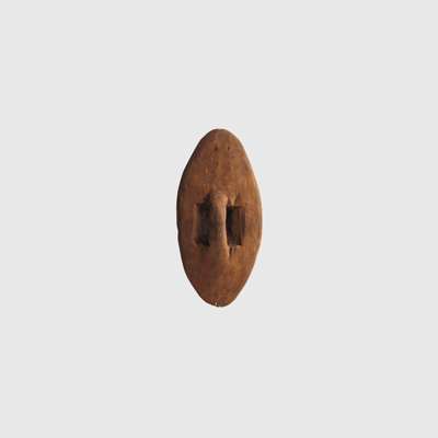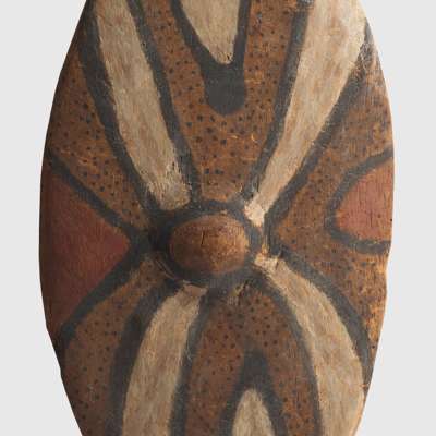 carved wood and pigment, the obverse adorned with geometric patterning, with an integral handle to the reverse