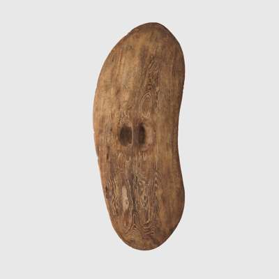 carved fig root and pigment, of classic kidney form, with central protruding boss, adorned with a geometric design composed of intersecting linear elements forming lozenge motifs, rendered in red and white natural pigments against the darkened ground, the reverse is plain, with an integral handle