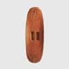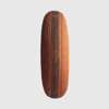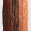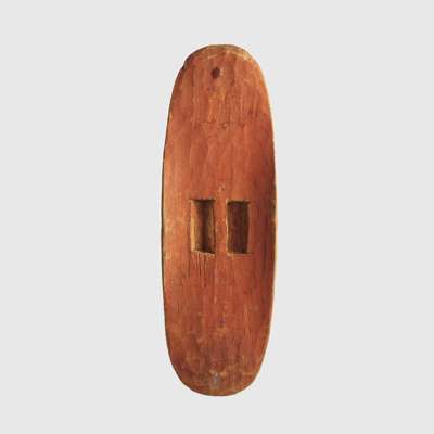 painted and carved wood, of oval form, adorned with longitudinal grooves, the obverse with an all-over red pigment and central black stripe with white border, integral handle to the reverse, accompanied by a bracket intended for wall mounting
