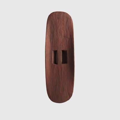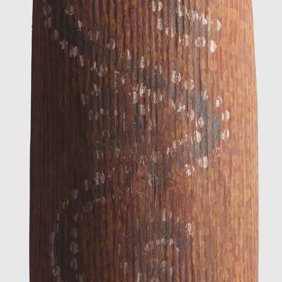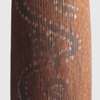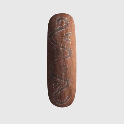 carved wood and pigment, of elongated oval form, the surface finely incised with longitudinal grooves, red, black and white decoration to obverse, integral handle to reverse