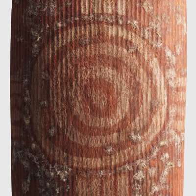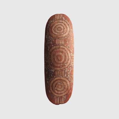 carved wood, natural earth pigments and feathers, decorated with three concentric circular motifs in relief, alternating with vertical lines, accompanied by a bracket intended for wall mounting